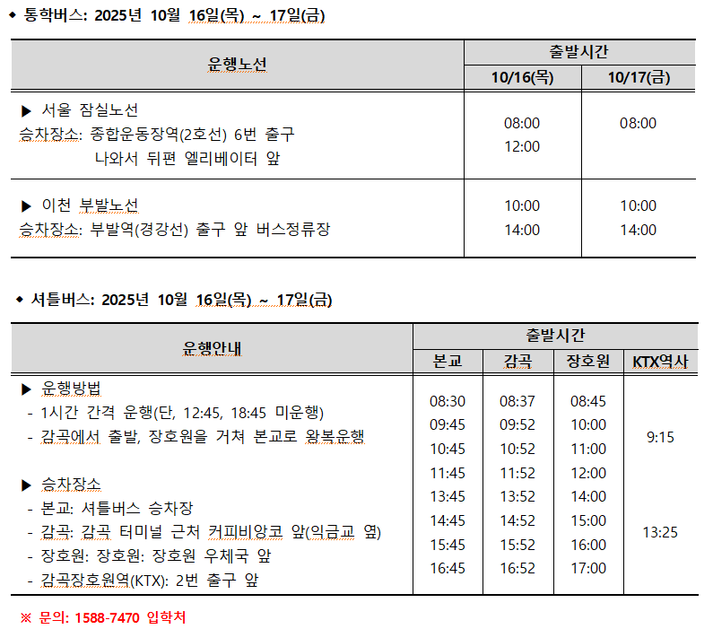 - 대중교통(버스) 이용시 감곡 또는 장호원 하차 후 본교 셔틀버스 이용 가능