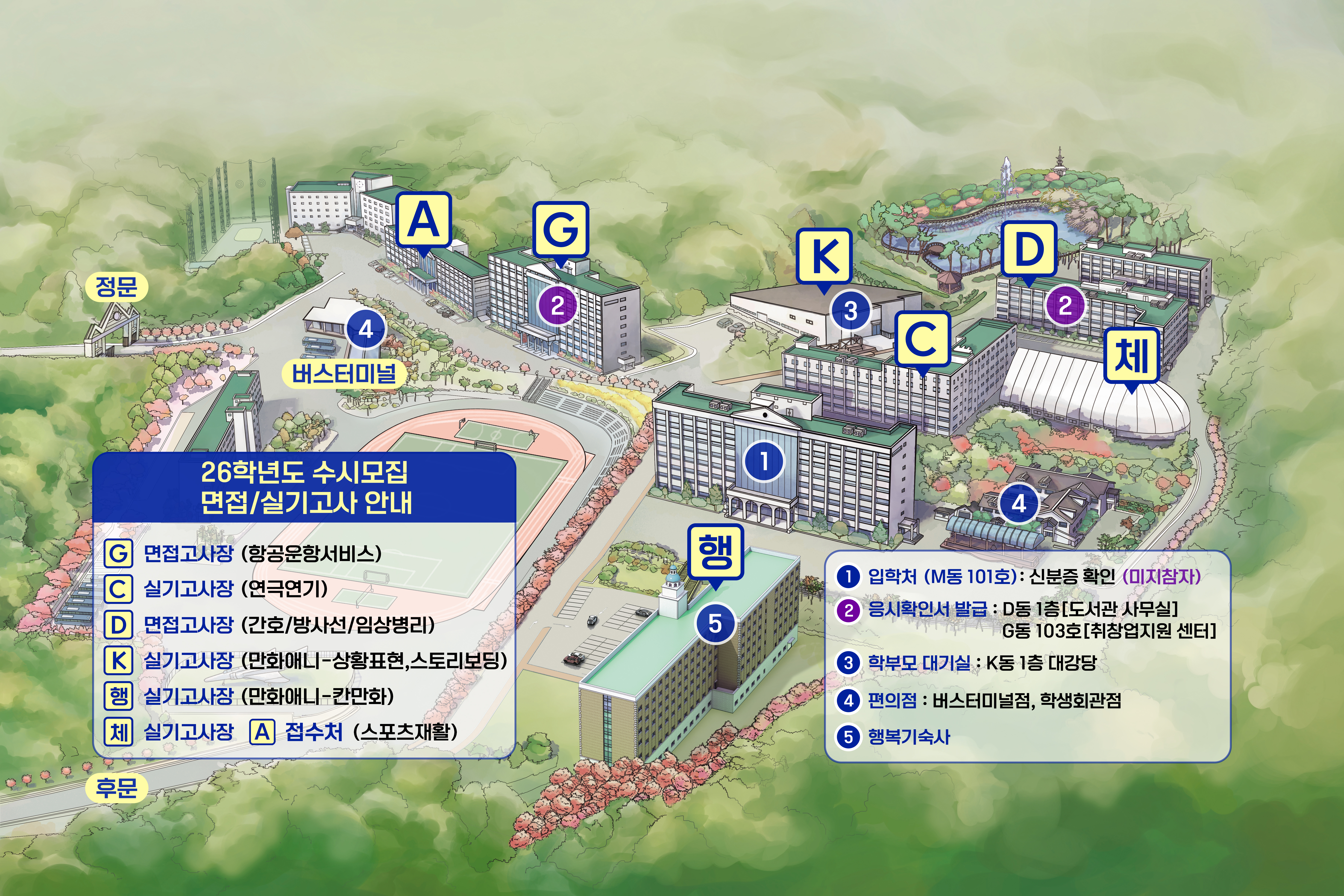 • 통학버스를 이용할 경우 통학버스터미널에서 하차 후 홍보대사 안내에 따라 각 고사장으로 이동