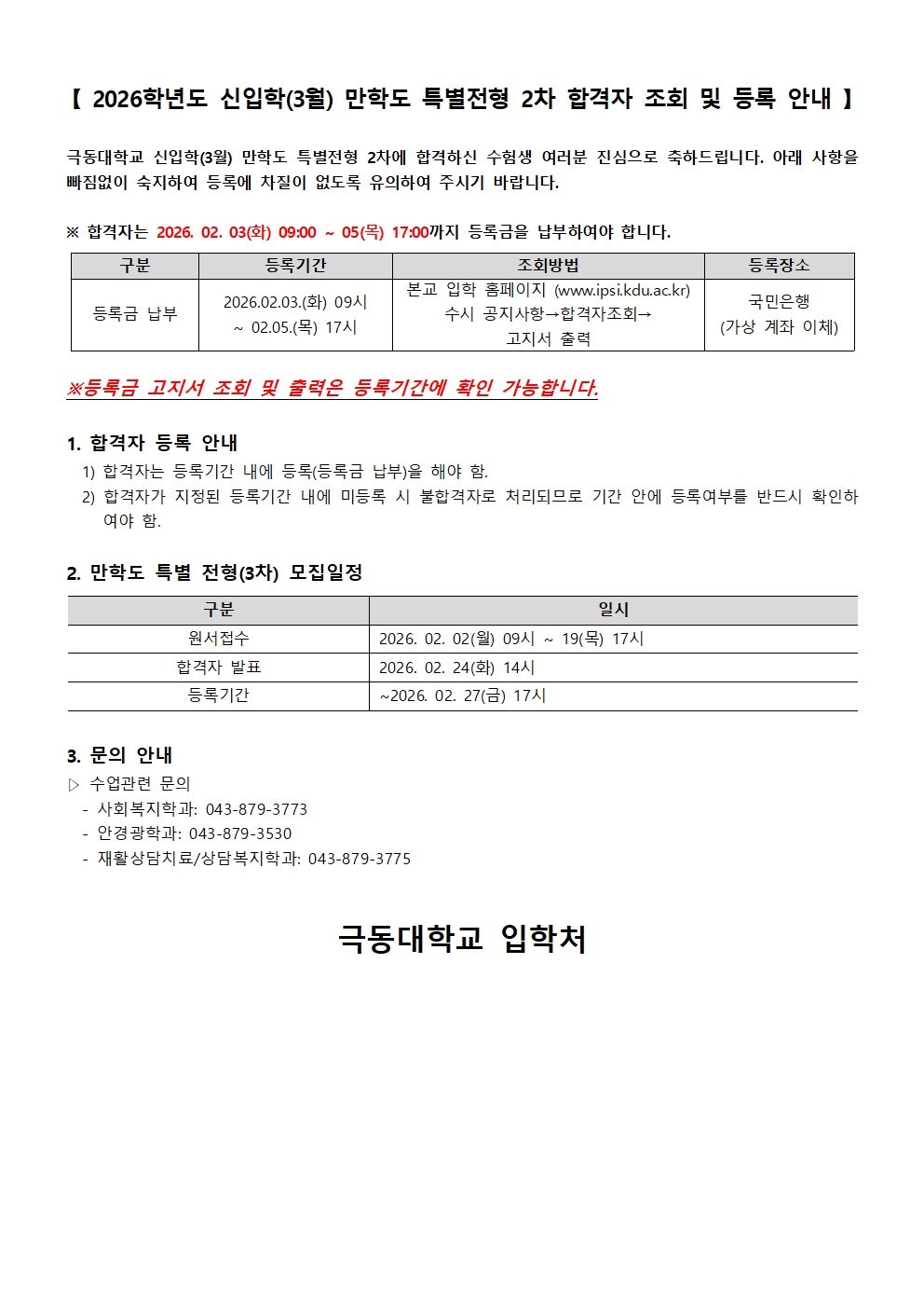 2026학년도 신입학(3월) 만학도 특별전형 2차 합격자 조회 및 등록안내