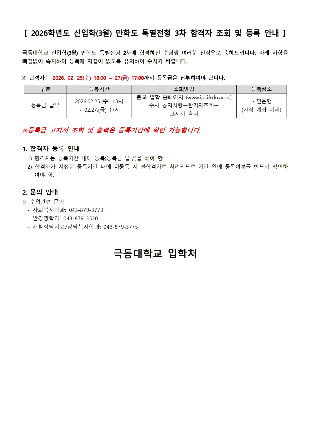 2026학년도 신입학(3월) 만학도 특별전형 3차 합격자 조회 및 등록안내