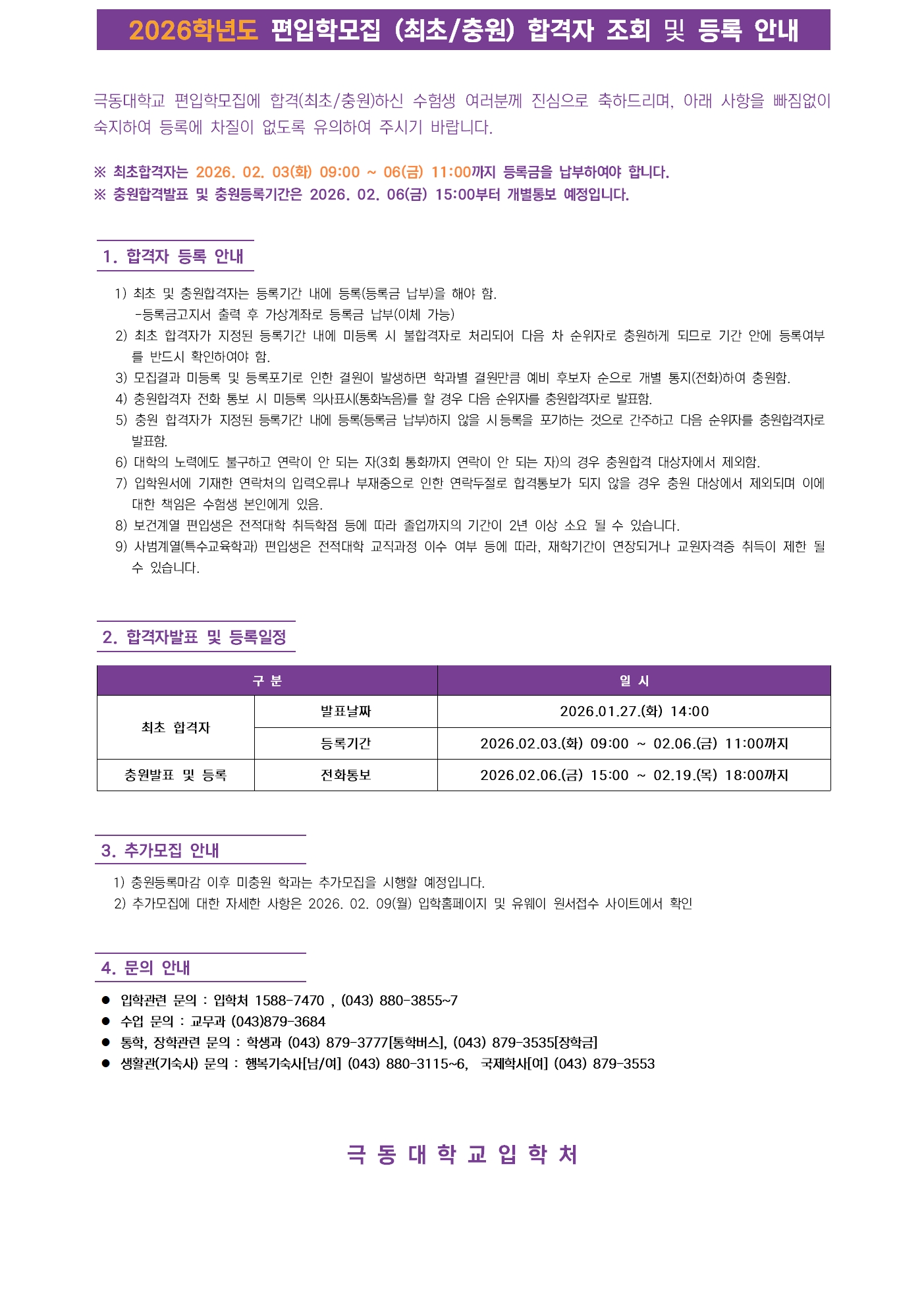 2026학년도 편입학모집(최초/충원)합격자조회 및 등록안내