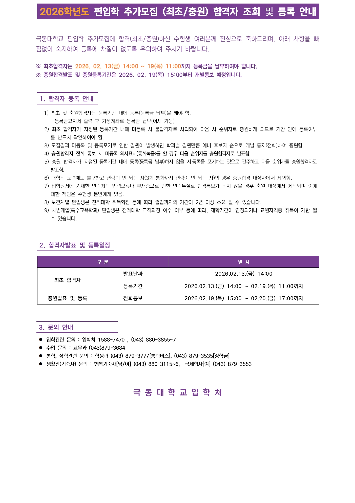 2026학년도 편입학 추가모집 (최초/충원)합격자 조회 및 등록안내