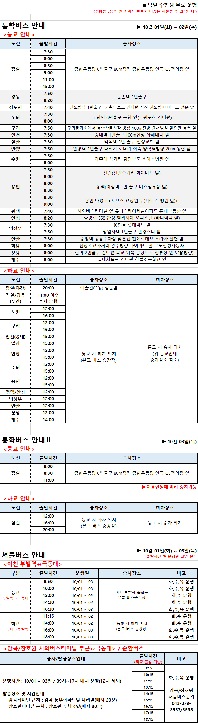 2020학년도 수시 면접/실기고사 지원자 무료 통학/셔틀버스 안내