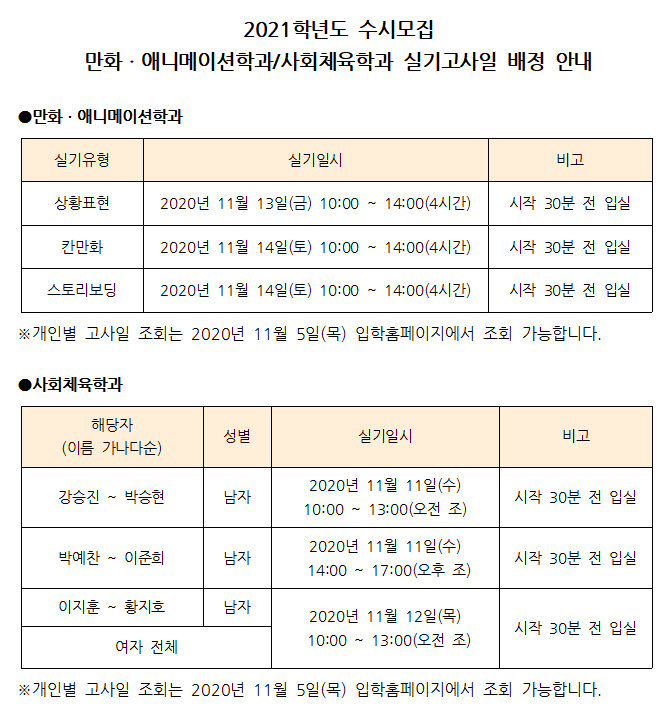2021학년도 수시 만화애니메이션학과/사회체육학과 실기고사일 지정 안내